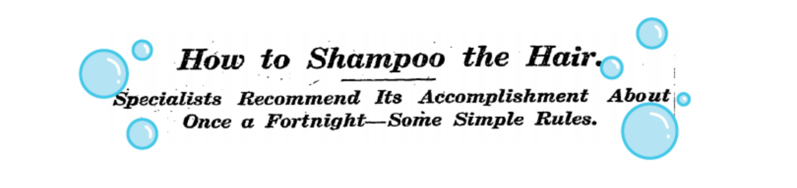 The New York Times outlines “simple rules” on “How to Shampoo the Hair.” It claims that hair is best shampooed at night, following thorough combing and brushing, and singeing split ends. Castile soap is applied with a stiff brush, rinsed four times. Hair specialists, “Recommend shampooing every month to six weeks if the hair is in fairly good condition.”